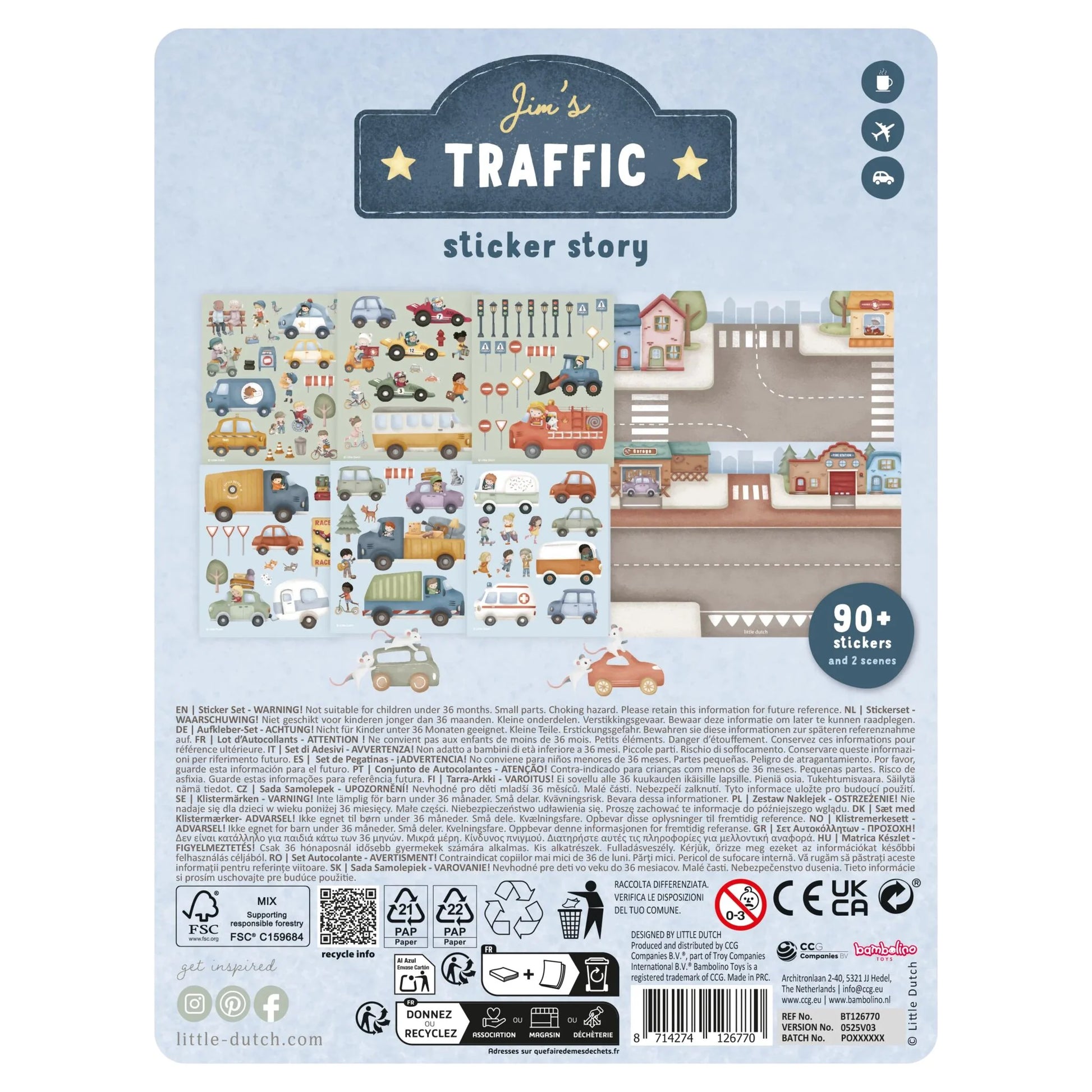 Conjunto de autocolantes Essentials Jim com mais de 100 stickers e cenário dupla face. Ideal para estimular a criatividade e criar histórias divertidas.